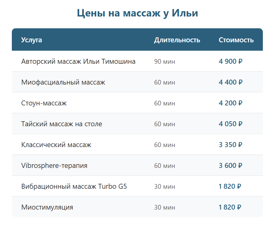 Флагманская услуга — та самая комплексная методика, которую мы описали выше. Сочетание диагностики, миофасциальной работы, точечного воздействия и тайских элементов.