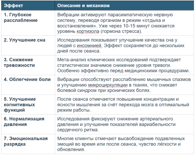 На основе научных исследований и клинического опыта можно выделить следующие эффекты звукового массажа: